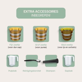 - Toerental: 40 r/min — langzaam persen voor maximale behoud van voedingsstoffen