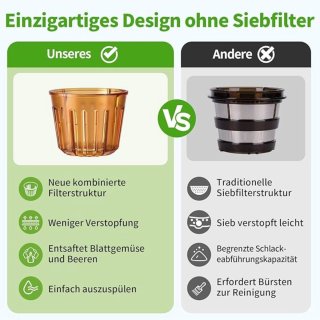 Het ontwerp heeft markeringen met een rode stip om het apparaat snel te demonteren en een revolutionair zeefontwerp dat pulpophoping vermindert. De verwijderbare plastic onderdelen zijn vaatwasserbestendig en er wordt een reinigingsborstel meegeleverd voor moeilijk bereikbare plekken. Maak de motorbasis af met een vochtige doek en zet onderdelen na reiniging goed terug volgens de rode stippen.