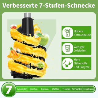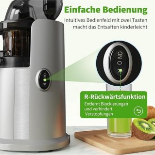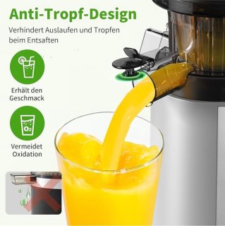 Doordat de juicer op lage snelheid draait is hij aanzienlijk stiller dan centrifuges en geschikt voor regelmatig gebruik zonder veel geluidsbelasting. Het compacte ontwerp (ongeveer 40 cm hoog, 20 x 20 cm) en het gewicht van circa 5 kg zorgen voor stabiliteit tijdens gebruik. De automatische uitschakeling en antislipbodem dragen bij aan veilig en betrouwbaar dagelijks gebruik.
