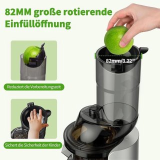 Dankzij de dubbele vulopening van 82 mm kun je grote stukken fruit en groenten vaak direct toevoegen, wat snijwerk bespaart. Je kunt zachte vruchten, bladgroenten en harde wortels zoals wortel of gember gebruiken; heel harde of vezelige producten en harde pitten moeten vooraf worden verwijderd of in kleinere stukken gesneden. Voor citrus is er een meegeleverd accessoire (citruspers) dat het persen van sinaasappel en citroen vereenvoudigt.