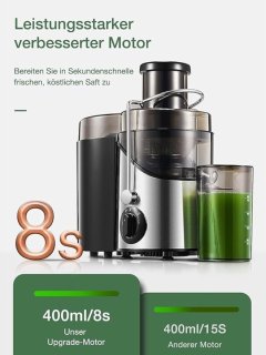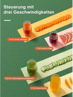 De Soft-stand draait circa 50–60 omwentelingen per minuut en is ideaal voor sappig fruit zoals druiven, kiwi's en sinaasappels, terwijl de Hard-stand met circa 100–110 omwentelingen per minuut geschikt is voor harde producten zoals appels, wortels en gember. Gebruik Soft voor zachte ingrediënten en bladgroenten om schuim en oxidatie te verminderen, en Hard voor harde groenten en wortels om maximale sapopbrengst te krijgen.