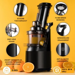 - Gebruiksvriendelijk en eenvoudig schoon te maken: De onderdelen zijn BPA-vrij en grotendeels vaatwasserbestendig. De onderdelen zijn gemakkelijk te demonteren en er is een praktische spoelfunctie om sapresten snel te verwijderen.